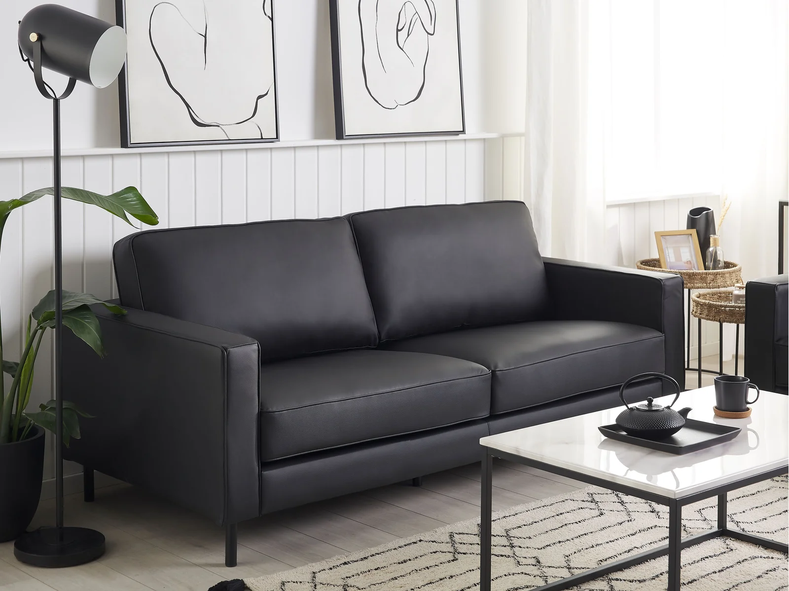 Aliante Modern Metal Ayak Çift Kişilik Koltuk Montajsız Suni Siyah Deri Lobi Koltuğu Ofis Ev Koltuğu